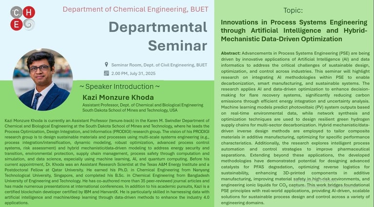 Dr. Kazi was invited by the Department of Chemical Engineering at BUET for a research seminar on July 1st. He engaged with bright, enthusiastic students who are eager to explore how AI/ML and blockchain can be integrated into chemical processes.