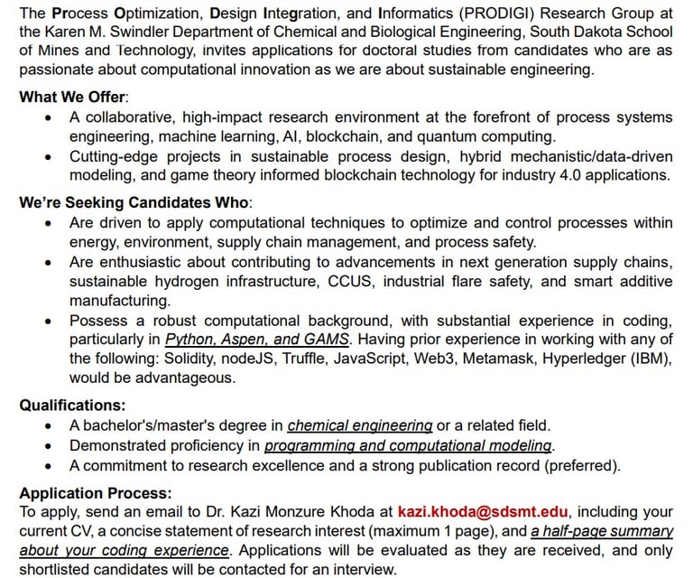 We are always looking for highly motivated students, including PhD, MSc, and undergraduate students, to join our group. If you are interested in process control, optimization, and innovation at the intersection of technology and engineering, please email kazi.khoda@sdsmt.edu